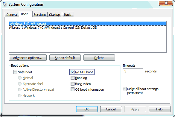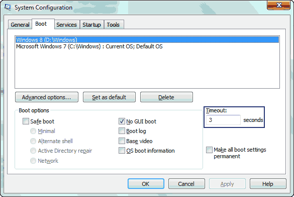 Boot timeout is the amount of time for which the OS shows the options to select the OS when you have multiple active operating systems installed, or the time for which it shows the menu for startup repair, or any other menu while booting up the computer. This is by default set to 30 seconds on Windows XP, Windows Vista, Windows 7 and Windows 8. But this is a lot of time user will ever take to make a choice. Decrease it to whatever the least value you want. In my case I have Windows 7 and Windows 8 installed and I have set the Boot Timeout to 3 seconds.