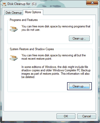 - You can additionally delete System Restore points and Shadow Copies if you wish to, these are the backups that Windows take so that you can any time go back in time and all your files will be restored. This is found in the More Options tab. Deleting these restore points is completely safe since the most recent backup will not be deleted.