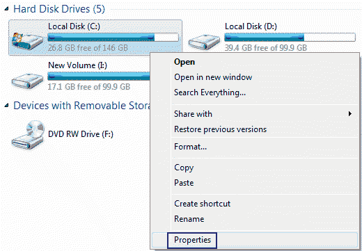 - Right Click on the Windows installation drive ( usually C: or with a Windows logo on it ) and click on Properties