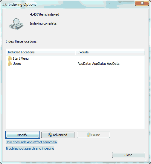 Windows 7′s Search is great but it takes high amount of resources. When your computer is running, it continuously works in the background and indexes your files to give you instant results. So, if you do not use Windows search or use it on rare occasions then you should either disable it or optimize it by limiting the locations which are indexed by Windows search.