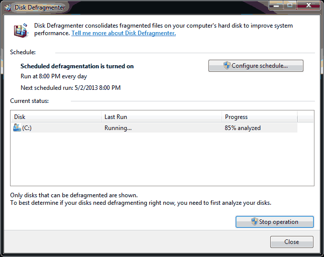NOTE I recommend you to schedule the defragmentation of the drives at least once in a week and specially for the Windows installation drive.