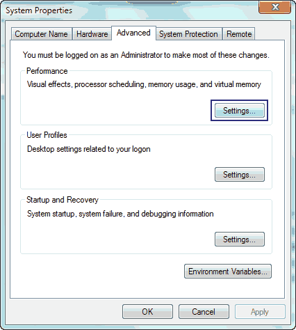 - Go to Advanced tab and select Settings under Performance menu.
